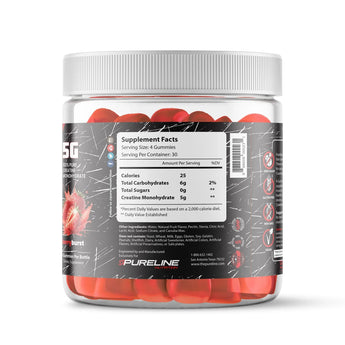 At Pureline we’ve married innovation with science and created one of the most fun and unique creatine formulas to date! Introducing Gummy Gainz, bite sized and delicious creatine monohydrate gummies that deliver 5 grams of 100% pure creatine monohydrate per serving. 4 Gummies deliver all the benefits of creatine monohydrate in a tasy and delicious form.